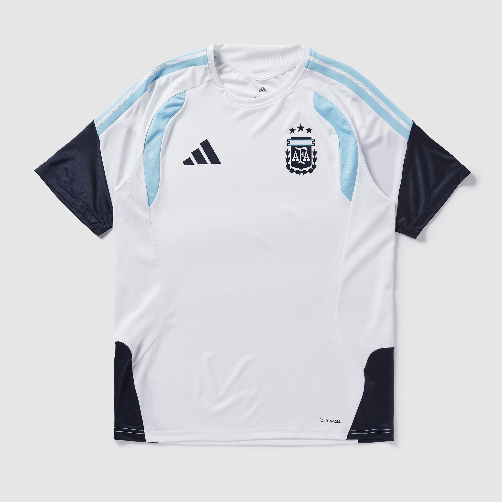 Train like a champion in the adidas Argentina 2026 Training Shirt. This official World Cup jersey features the iconic AFA crest and sharp white design with Navy and Icy Blue accents. Built with Climacool moisture-wicking technology and stretchy fabric for unrestricted movement, it keeps you cool during intense workouts. Made from 100% recycled polyester, it's the perfect choice for Argentine fans who want to perform with purpose.